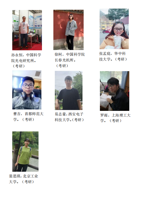 (2)深造机会:本专业毕业生考研录取率在本校常年位于前三名,每年有不低于20%的毕业生选择继续攻读硕士学位,部分学生进入中科院、复旦大学、北京理工大学、华中科技大学、电子科技大学、华南理工大学、华南师范大学、武汉理工大学、南京理工大学、长春理工大学等知名高校继续深造。