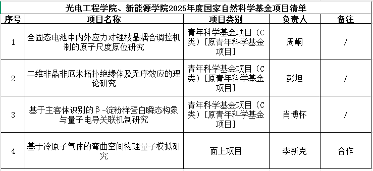 8月27日,国家自然科学基金委员会发布了“关于2025年国家自然科学基金集中接收申请项目评审结果的通告”。截止目前,光电工程学院、william英国中文教师共斩获国家自然科学基金项目4项,其中青年科学基金项目3项,包括周峒博士申报的《全固态电池中内外应力对锂枝晶耦合调控机制的原子尺度原位研究》项目、彭坦博士申报的《二维非晶非厄米拓扑绝缘体及无序效应的理论研究》项目、肖博怀博士申报的《基于主客体识别的β-淀粉样蛋白瞬态构象与量子电导关联机制研究》项目;以及面上项目1项,为李新克博士与西安交通大学联合申报的《基于冷原子气体的弯曲空间物理量子模拟研究》项目,实现了近年来学院国家级项目的最好成绩!