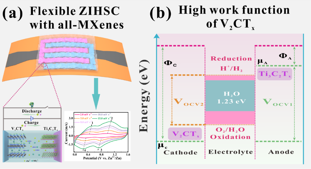 Zinc Ion Hybrid Micro-supercapacitor with Wide Voltage Window based on V2CTxCathode and Ti3C2TxAnode”。文章基于二维材料MXene,设计了一种具备高能量密度以及长循环稳定性的微型锌离子混合电容器。