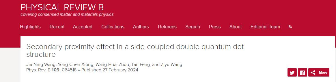 近日,我校微纳结构与量子器件团队和武汉大学工业科学研究院王教授团队合作,在凝聚态物理旗舰期刊Physical Review B(Nature Index期刊)发表了题为“Secondary proximity effect in a side-coupled double quantum dot structure”的研究成果。