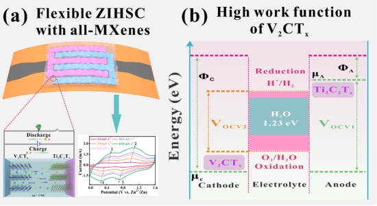 高效、安全的柔性微型电化学储能器件可推动柔性电子学和可穿戴微型电子器件的快速发展。锌离子混合微型超级电容器(ZIHMSC)具有高功率密度、优异的倍率性能和超长的循环稳定性,适用于可穿戴电子设备的供能单元。然而,由于ZIHMSC采用的是水系电解质,水的分解电压较低,限制了其能量密度的提高。因此,提升ZIHMSC的能量密度是重要的研究课题之一。对此,数理与光电工程学院新能源材料与器件团队基于对新型二维材料MXene的深入研究和理解,以全MXene为电极材料,采用一种非对称共平面结构的器件构筑策略,实现了能量密度的提升。全MXene ZIHMSC以具有高功函数的电池型V2CTxMXene作为阴极材料,电容型Ti3C2TxMXene作为阳极材料,并在ZnSO4电解质中稳定实现了1.60 V的宽工作电压窗口。得益于两种MXene材料的协同效应及共平面结构设计,器件表现出优异的电化学性能,面积比电容高达200.1 mF cm-2,充电/放电循环稳定性超过5000次,在400.7 μW cm-2时展现出71.6 μWh cm-2的高能量密度。另外,该研究结果还表明,全MXene ZIHMSC具有良好的柔韧性,在90°弯曲情况下可经受15000次的循环测试,证明其在可穿戴电子领域具有良好的应用前景。