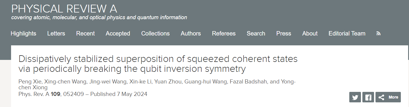 近日,数理与光电工程学院2022级研究生谢鹏同学以第一作者身份在国际物理学权威期刊《Physical Review A》发表了题为“Dissipatively stabilized superposition of squeezed coherent states via periodically breaking the qubit inversion symmetry”的学术论文。Physical Review A是美国物理学会(American Physical Society)主办的物理学术期刊之一,主要发表原子分子物理及光物理相关的高水平前沿学术成果,是国际物理学界广泛认可的享有高度学术声誉的期刊之一。