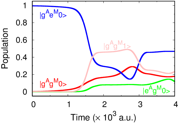 如左图所示,该工作将单个氟化锂分子与二能级原子同时与谐振腔相互耦合,但两者之间没有直接的相互作用,系统研究了二能级原子对氟化锂分子反应过程的影响和两者之间的能量传递过程。右图是系统的各个态随时间的演化,其中绿线是原子激发对应的布居数,由于原子和分子之间无直接的相互作用,这种能量传递只能由腔光子来介导,所以没有距离的限制,这打破了传统分子间能量传递无法超出10纳米的距离极限。与此同时,分子的反应过程也不可避免地受到腔光子的影响而改变,这意味着可以通过人为引入额外的原子或分子来调控目标分子的反应行为,为进一步拓展极化激元化学应用提供了新思路。