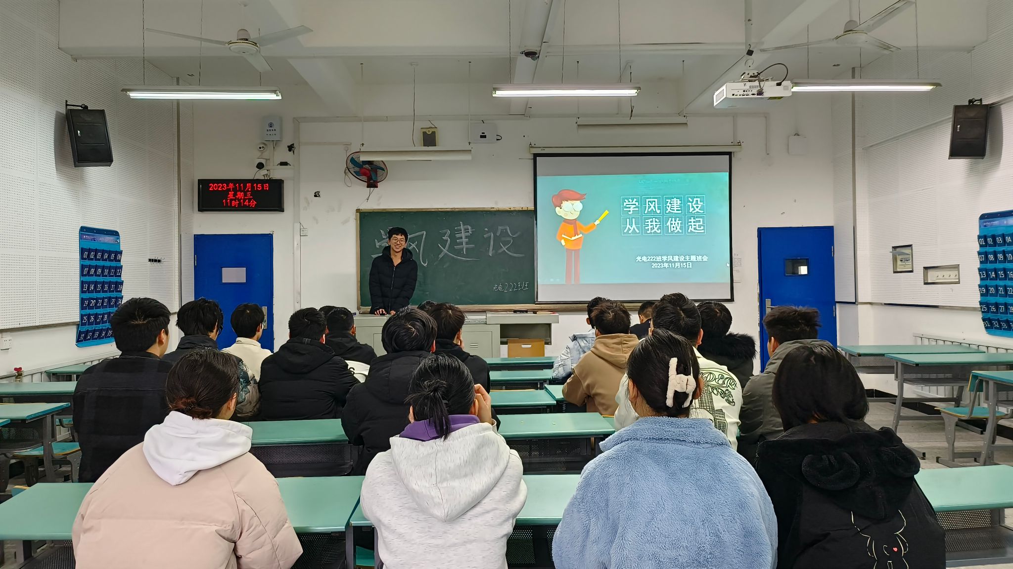 (本网讯)为进一步加强和改进学风建设,大力弘扬“问道好学、崇实笃行”的优良学风,11月15日至20日,数理与光电工程学院组织全院班级开展“踔厉奋发,逐梦铸魂”学风建设主题班会,各班班长主持活动。