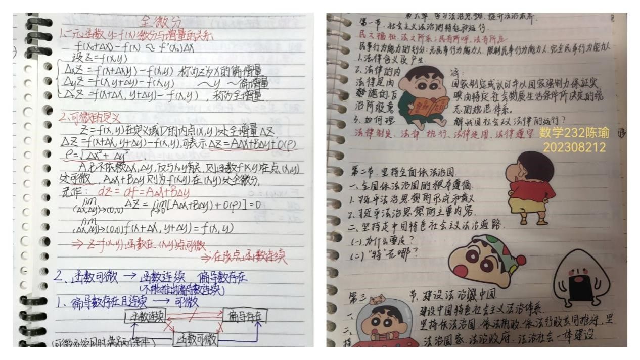 本次“最美笔记”评选活动得到了全院同学的积极响应,两天时间内收到101份笔记作品,涵盖了《高等数学》《线性代数》《大学英语》《材料科学基础》等多门课程笔记。简洁工整、重点突出的知识点梳理,思路明确、环环相扣的思维导图,绘制精美、标注清晰的图文说明,严谨规范的高数公式,标注详细的习题集等诸多笔记,通过笔记的内容结构、条理逻辑、形式创新和实用程度等标准进行初审和复评,最终数学222韩滢颖获一等奖;新能源221陈欣蕊、新能源221胡玉婷获二等奖;新能源233张开、数学Z225朱丽娜获三等奖;还有数学Z225梁佳蕊、数学Z224易明月等11名同学获得优秀奖。