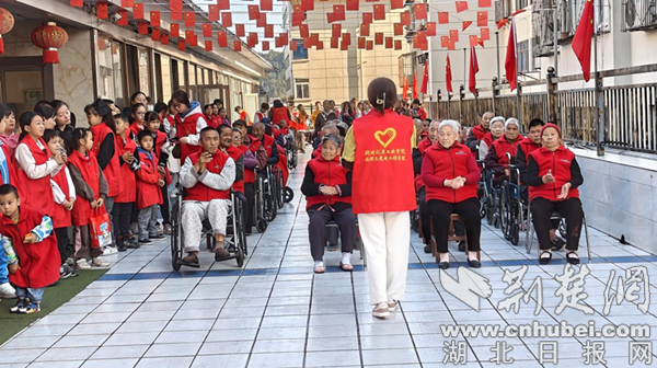 在十堰市张湾区高家湾社区活动大厅,十几位大学生志愿者和社区老年人们坐在一起沐浴着冬日的暖阳,诉说着家常,欣赏着精彩的歌舞、魔术、小品等节目。社区内充满了欢声笑语,志愿者们的热情服务给老人们带来了陪伴和温暖,老人们脸上露出了灿烂的笑容,现场氛围其乐融融。