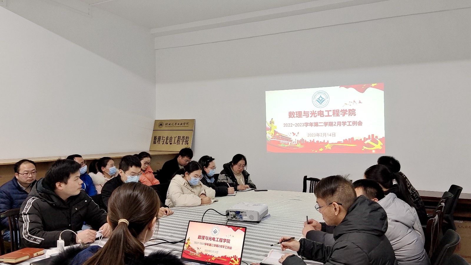 (本网讯)2月14日,新学期伊始,数理与光电工程学院在1114会议室召开2023年2月份学生工作例会,会议由学工办主任李童主持,辅导员卢旭、秦运来及全体班主任参加了会议。