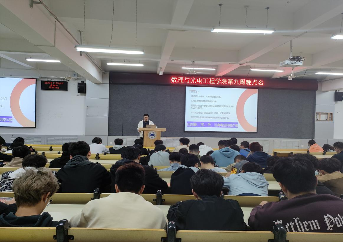 为增强同学们的安全意识,普及安全防范知识,提高防范安全风险的能力。11月5日晚上,数理与光电工程学院在第六教学楼教室分年级组织开展了以校园安全为主题的教育。活动由辅导员和班主任共同主持,全体21级、22级、23级学生参加。