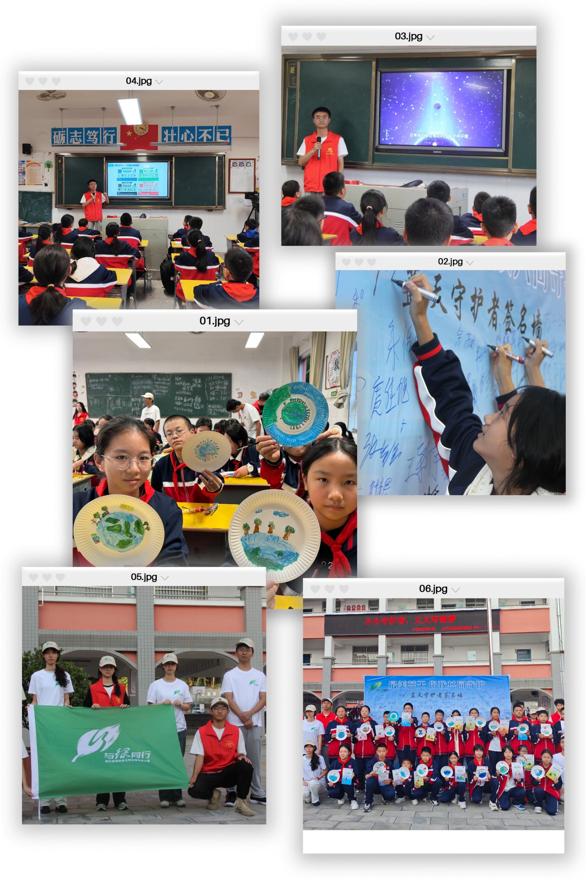 在环保手工制作环节,在志愿者的带领下,同学们用废旧纸盘创作出了心中的美好生态环境,传递了环保理念,在蓝天守护签名墙上签下了自己的承诺。