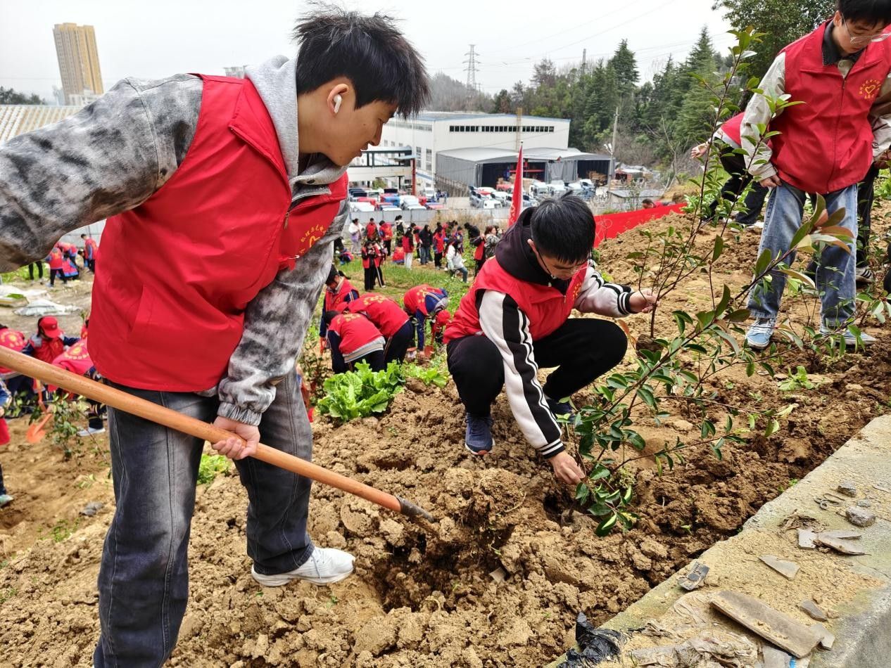活动伊始,志愿者们共领取20棵树苗。随后,志愿者们携带工具来到后山植树区域。植树过程中,志愿者们分工明确、配合默契。有的挥锹铲土,有的扶苗填坑,还有的浇水灌溉,每一个步骤都一丝不苟。针对较高的树苗,志愿者们们用木棍、竹竿进行支撑固定,以防被风吹倒。