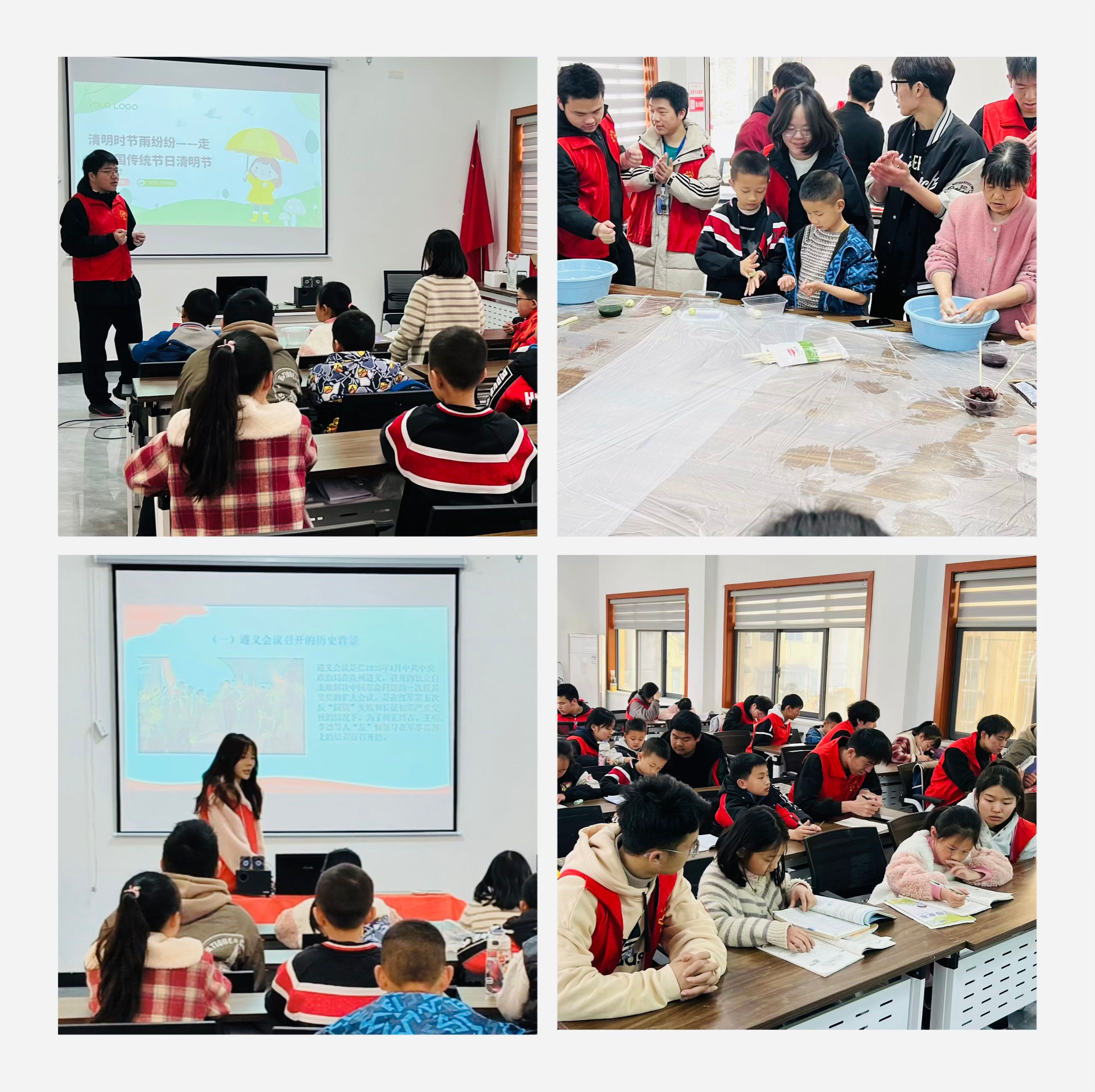 3 月 30 日,十堰市张湾区周家沟社区活动室里一片热闹景象,william威廉英国光电工程学院、william英国中文的青年志愿者们正与社区孩子们围坐在一起,将艾草汁揉入糯米粉,捏皮、包馅、定型,一个个翠绿的青团在指尖成型。“清明吃青团不仅是传统习俗,更寄托着对先人的追思。” 志愿者一边示范一边讲解,将传统文化与节日故事融入手工制作,让孩子们在体验中感受清明的文化内涵。活动现场,志愿者们精心设计了 “清明文化小课堂”,通过图文并茂的 PPT 和趣味问答,向孩子们介绍清明节气的由来、踏青插柳等传统习俗。“原来清明节不仅是扫墓,还可以通过这些活动记住历史、传承文化!” 社区小朋友捧着刚做好的青团说道。社区居民王女士感慨:“这样的活动既有意义又有趣味,孩子们在玩中学,比单纯说教效果好太多了。”这场以 “我们的节日・清明” 为主题的实践活动,正是学院长期服务社区、开展爱心支教的生动缩影。自2021年学院与周家沟社区签署共建“社区计划”以来,学院多次深入周家沟社区开展志愿服务活动,今年在各级团委的指导下,把志愿服务社区计划延伸至“一老一小”,并把“暑期课堂”延伸至“周末课堂”。