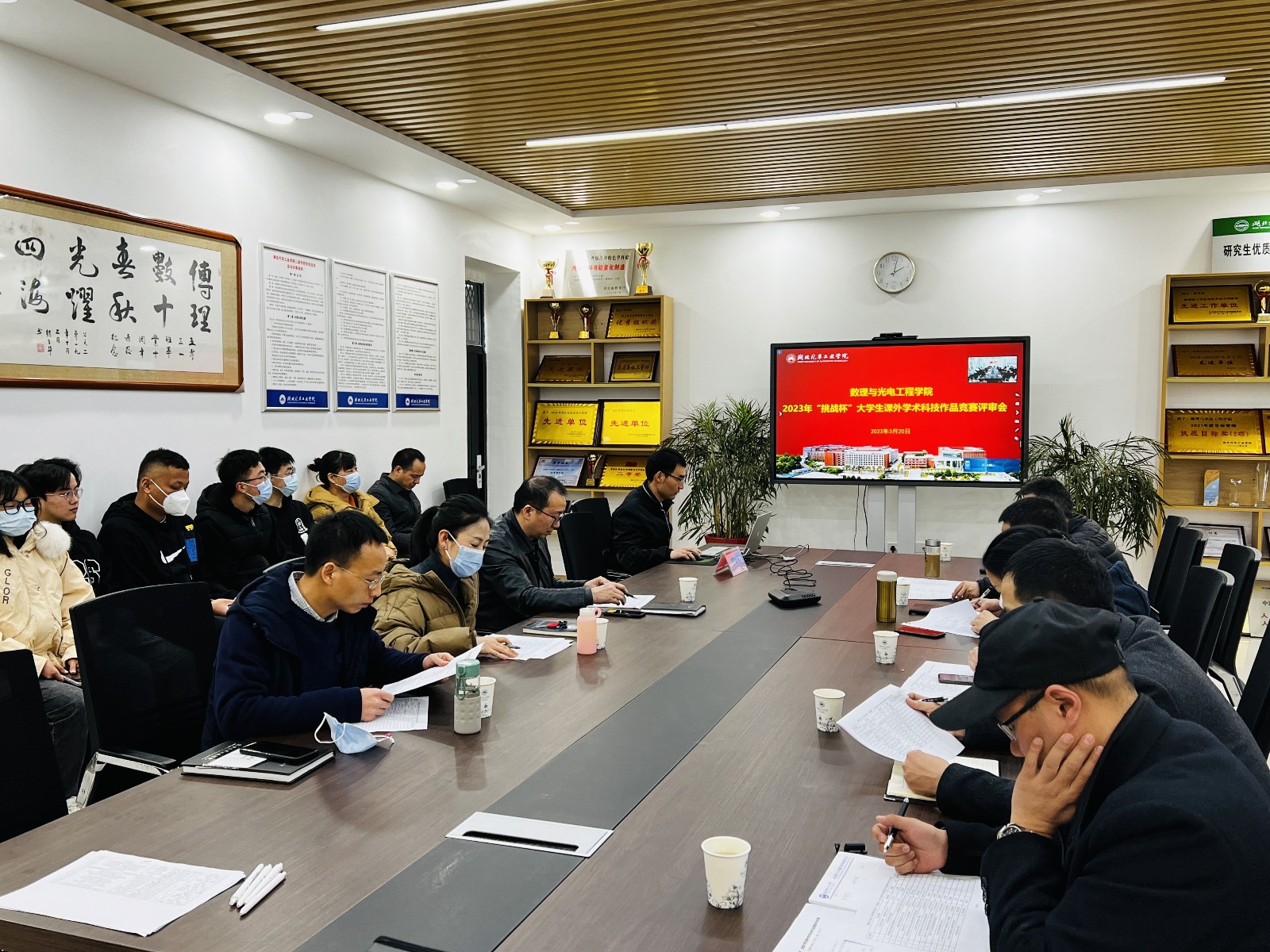 (本网讯)2023年3月21日下午,数理与光电工程学院2023年“挑战杯”大学生课外学术科技作品竞赛答辩会在第一教学楼1126会议室举行,武汉产学研基地答辩代表通过腾讯会议参加会议,数理与光电工程学院分党委书记张默、副院长胡政发、熊永臣,院长助理刘开拓、张传坤,光电科学与技术系、材料物理系、数学与应用数学系主任,物理实验中心主任担任本次答辩会评委并进行立项指导,共有14个参赛项目代表参会。