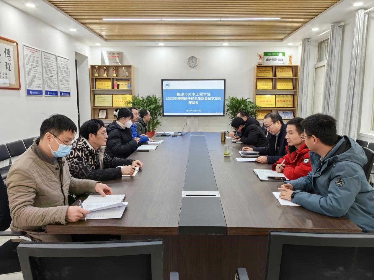 (本网讯)2月15日下午,数理与光电工程学院分党委在1126会议室召开2022年度学院领导班子民主生活会征求意见座谈会。学院领导班子成员、党员、党外人士和群众教师代表参加了会议。会议由学院副院长、纪检委员胡政发主持。