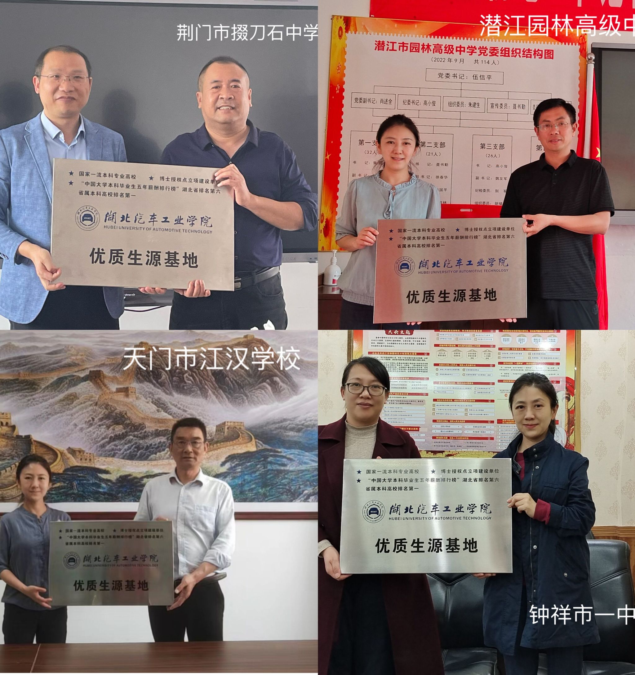 (本网讯)为进一步加强与生源高中的交流,做好2023年招生宣传工作。4月18日至23日,数理与光电工程学院分党委书记张默、院长李建带队赴荆门、天门、仙桃、潜江等地开展2023年本科招生宣传工作,与高中校长老师们面对面宣传介绍湖北汽车工业学的办学历史、办学特色、办学优势、“三步走”发展战略以及招生政策,通报了近年来学校在各高中录取及学生培养情况,各高中对学校近年来取得的优异成绩给予了充分肯定,并就今年的招生宣传工作提出了许多宝贵意见与建议。学院在荆门市掇刀石中学、潜江市园林高级中学、天门市汉江学校、钟祥市第一中学建立了优质生源基地。