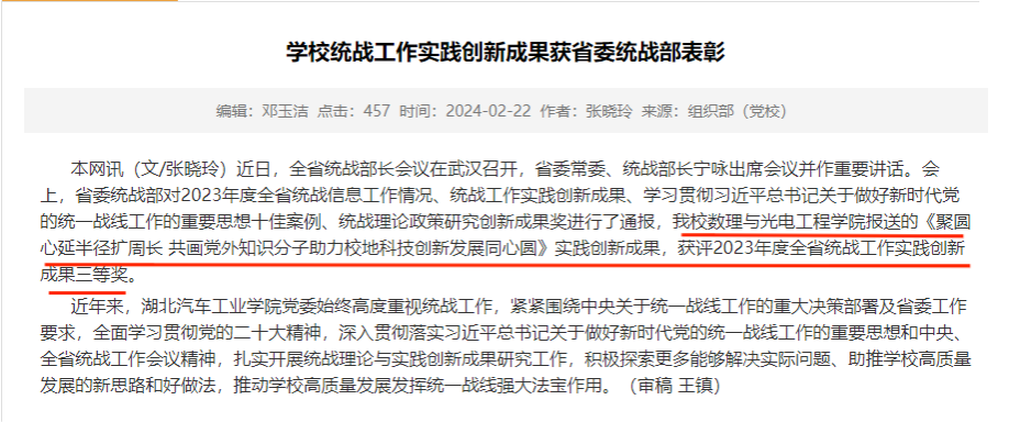 2023年学院光学工程硕士学位授权点通过教育部专项核验;学院获批湖北省卓越工程师校企联合培养项目1项,获批校级研究生质量工程项目2项,获批校级学科创新团队3个;ESI工程学论文被引频次达389次,被引论文达23篇,其中高被引论文9篇。