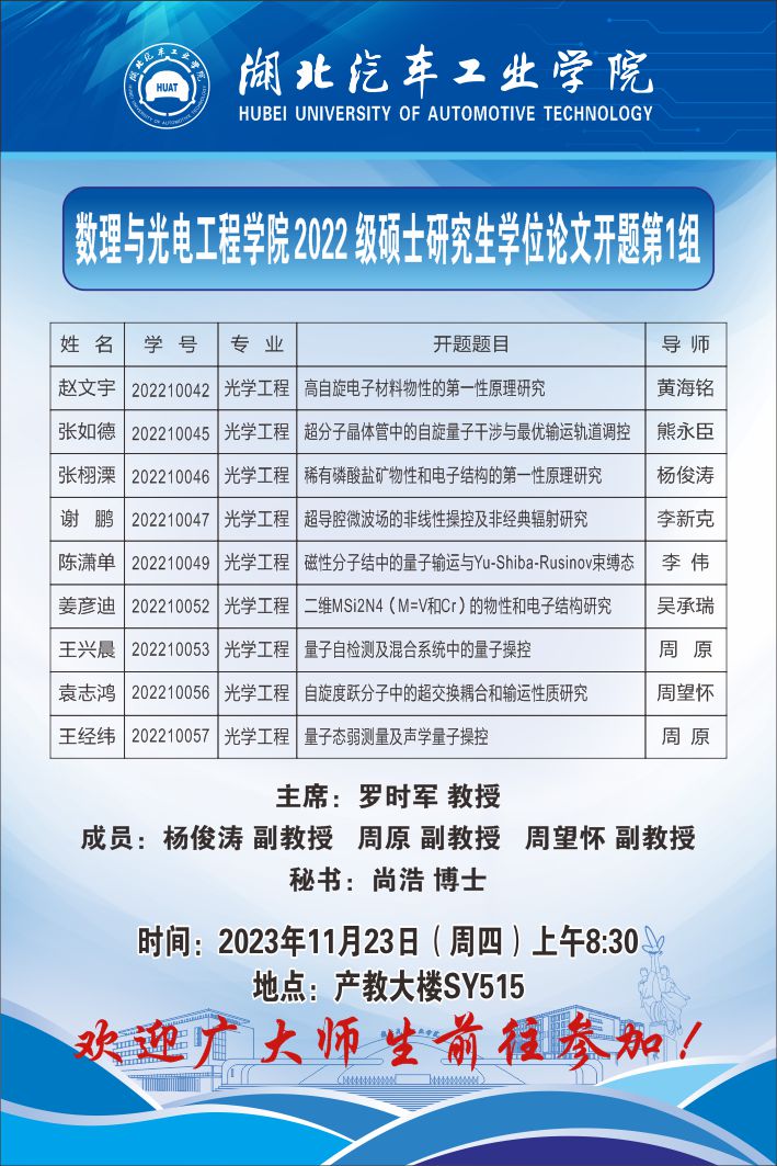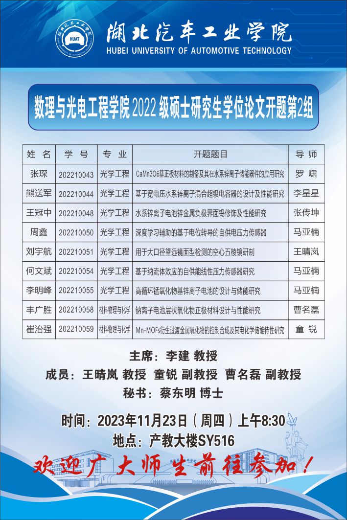 根据国务院学位委员会、教育部《关于进一步严格规范学位与研究生教育质量管理的若干意见》(学位[2020]19号)的要求,以及学校《关于做好2022级硕士研究生学位论文开题工作的通知(汽院研通〔2023〕27号)》的要求,结合《william威廉英国研究生学位论文开题报告管理办法》,现将数理与光电工程学院2022级硕士研究生学位论文开题答辩工作安排公告如下: