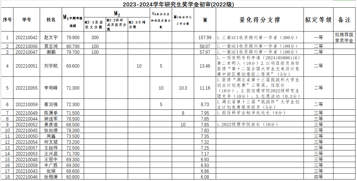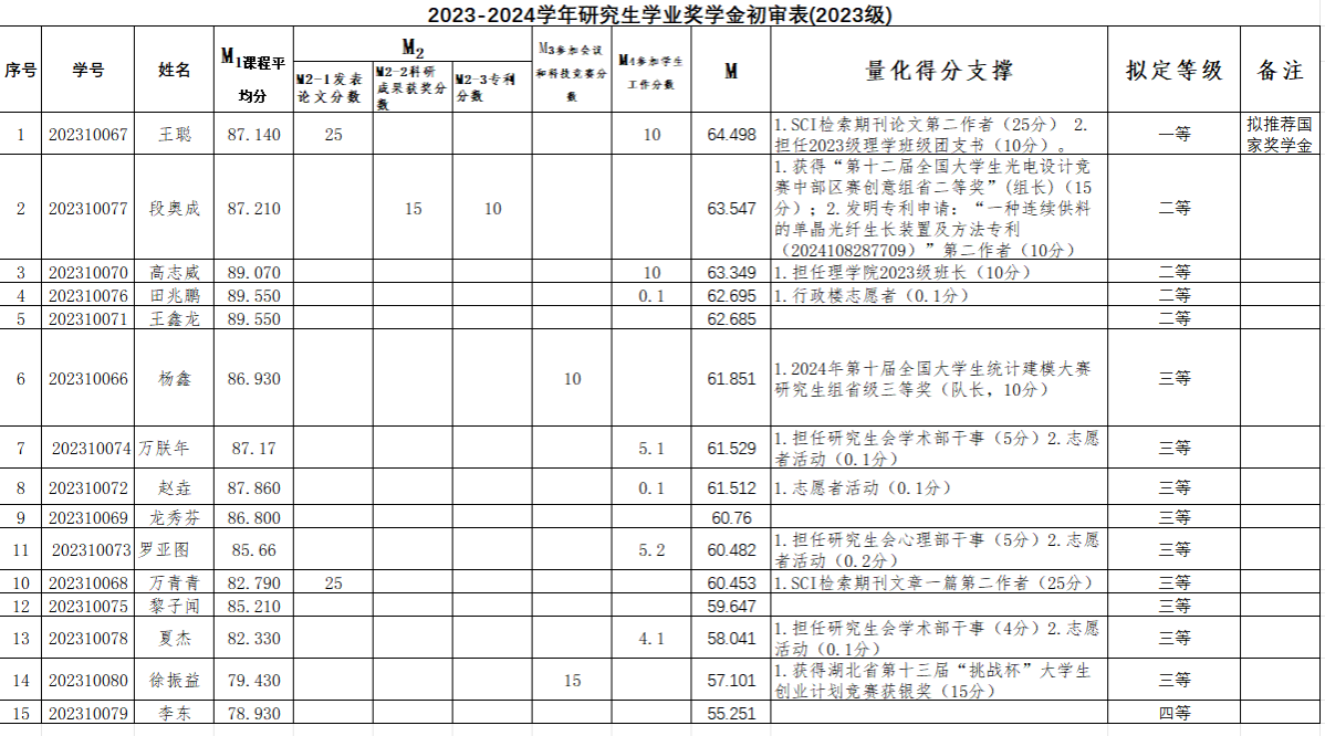 根据《省教育厅 省财政厅关于印发研究生奖助学金管理办法的通知》(鄂教财〔2014〕8号),湖北省教育厅2024年研究生奖助学金评审工作的相关要求、《william威廉英国研究生奖助学金管理办法(试行)》的有关规定以及《关于开展2023—2024学年研究生学业及国家奖学金评审工作的通知(汽院研工通〔2024〕5号)》,结合《数理与光电工程学院2023—2024学年研究生奖学金评定量化计算办法》。经研究生们个人申请,学院审核评选,现将2023-2024学年研究生学业奖学金学院初评结果进行全院公示,公示期为5个工作日,2024年10月11日至10月16日,在此期间若有异议,请于2024年10月16日前将意见反映至1118办公室王晴岚老师处。