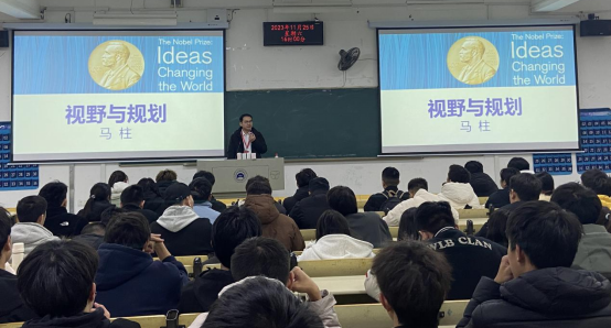 马柱向同学们分享了自己的成长历程,讲述了他如何度过了自己的精彩大学生活,如何通过考研实现了自己读博和出国的目标以及在这个过程中自己的视野是如何不断扩宽的。他结合自身学习经历,希望各位同学能够把握好大学时光,保持对所学专业的兴趣和热情,掌握科学的学习方法,加强专业课学习,掌握过硬的专业知识和技能。他结合自身工作经历,交流了社会需要什么样的人才,学生在学校里应该向哪些方面学习,以及走出校门后如何让自己成为行业中的人才,他希望同学们能吃苦耐劳,做到谦虚上进,向周围优秀的人虚心请教,不断提高自己的工作能力和水平,一定要尽早做好生涯规划,尽可能继续深造,追求更高的目标。